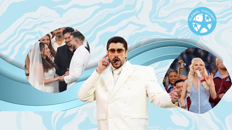Los cameos, las referencias culturales y los gestos de unión fueron hermosos. Entre ellos, el simbolismo de las bodas, que no son solo un acto romántico, sino rituales profundamente comunitarios: celebraciones colectivas con familia extendida, amigos, música, baile, comida típica y un gozo que dura hasta que el cuerpo dice basta. No se trataba de hablar de un matrimonio literal, sino de una unión cultural: mezclar raíces, música, tradición y espectáculo en el escenario más visto del mundo. Una fiesta que, como escribe Byung-Chul Han en Elogio de la inactividad, suspende el tiempo: “La intemporalidad es la esencia de la fiesta (...). En el tiempo de la fiesta, la vida ya no es supervivencia; la fiesta confiere a la vida más esplendor que la acción” (Han, 2023: 100–101). [1]